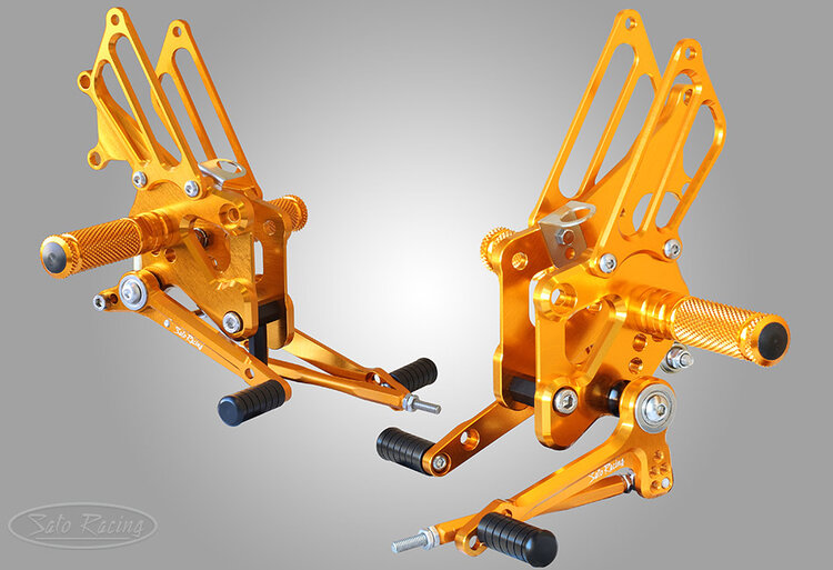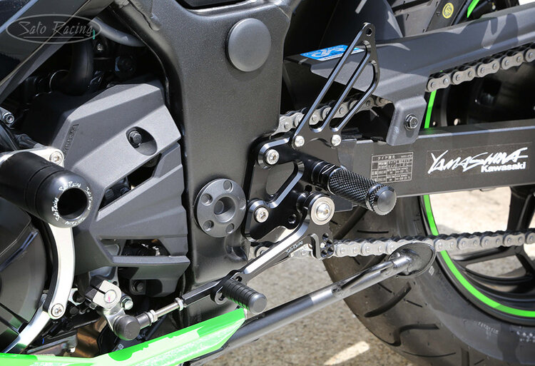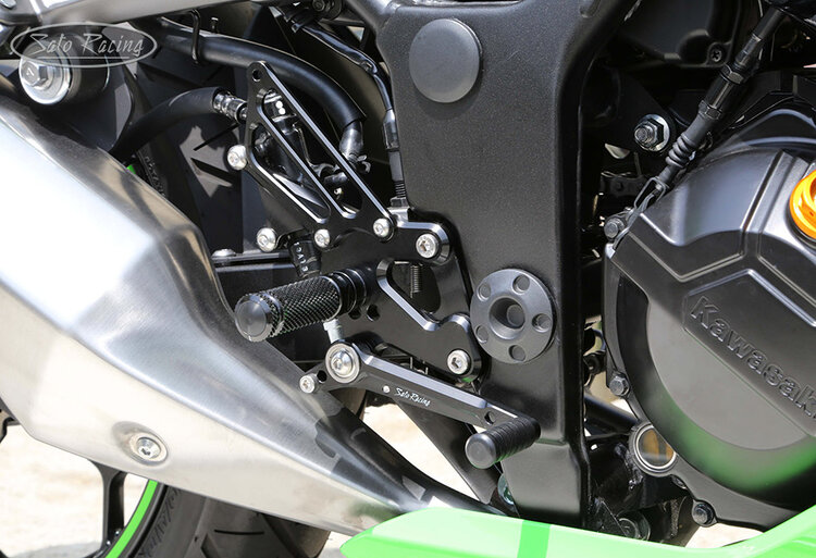 SATO RACING Rear Sets for 2013-17 Kawasaki Ninja 300* features a track-engineered design, with components precision CNC-machined out of light-weight, high strength anodized billet aluminum, with stainless steel bolts and hardware. 4 foot peg positions provided by this set are Up / Back compared to the stock foot peg position, for a more aggressive position well-suited for spirited riding. These premium Rear Sets have a 'street'-friendly design: Fully compatible with the stock brake light switch and ABS. Choice of Black, Silver or Gold finish.
