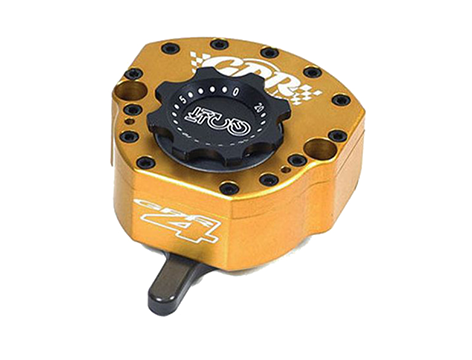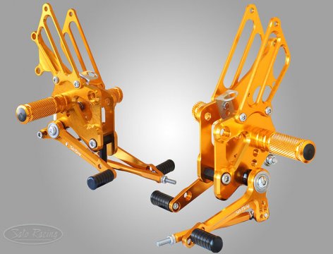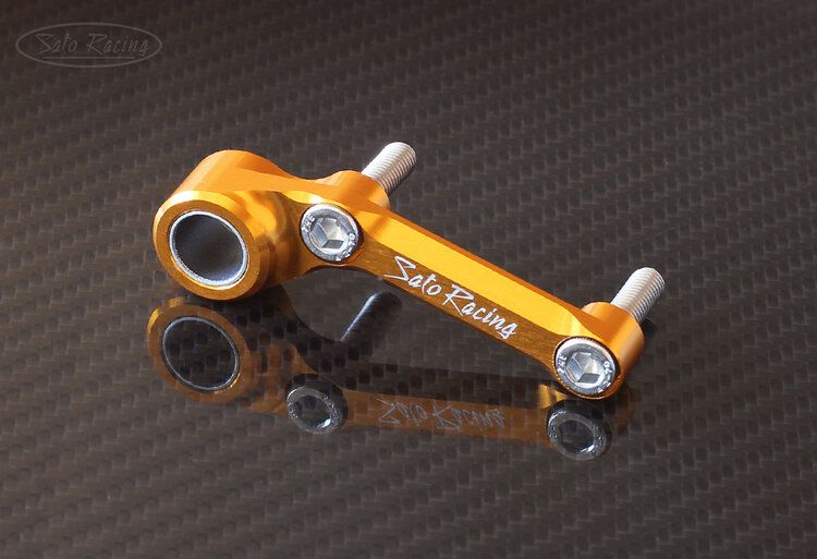 SATO RACING Shift Spindle Holder [GOLD] for 2006-12 Triumph Daytona 675/R, 2007-16 Street Triple 675/ R/RX and 2021-23 Triumph Trident 660 (part# T-675RS-SHDR) is a support bracket for the shift spindle, reinforcing it to reduce lateral play in the spindle shaft for more consistent and precise shifting and extra durability in heavy-duty use. This specialized part was originally developed for endurance racing (Suzuka 8 Hours, etc), where racing rear sets and non-standard shifter setups can put extra stress on the spindle. Precision CNC-machined from high strength billet aluminum with a Gold anodized finish and a Teflon inner bushing.