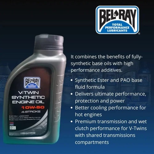 Bel-Ray V-Twin Synthetic Engine oil 10W-50 (4 Stroke) diformulasikan secara khusus untuk melindungi dan memberikan performa terbaik pada mesin V-Twin.