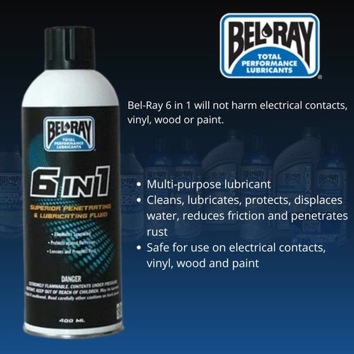 Bel-Ray 6 in 1 mengandung aditif yang memberikan perlindungan dan pelumasan yang luar biasa. Bel-Ray 6 in 1 membersihkan sekaligus melindungi dari karat.